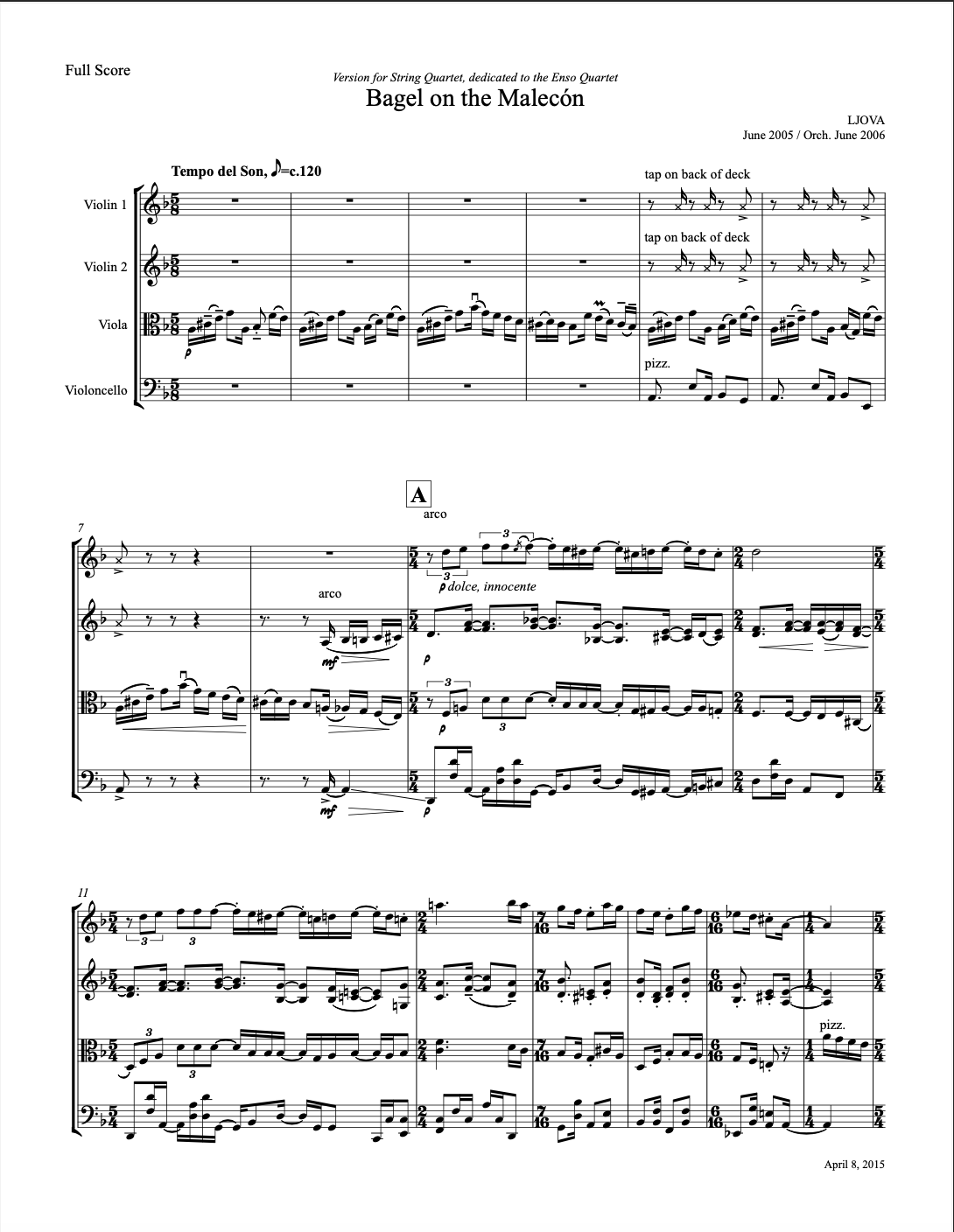 Here is the Enso String Quartet playing the string quartet arrangement of “Bagel on the Malecón”: