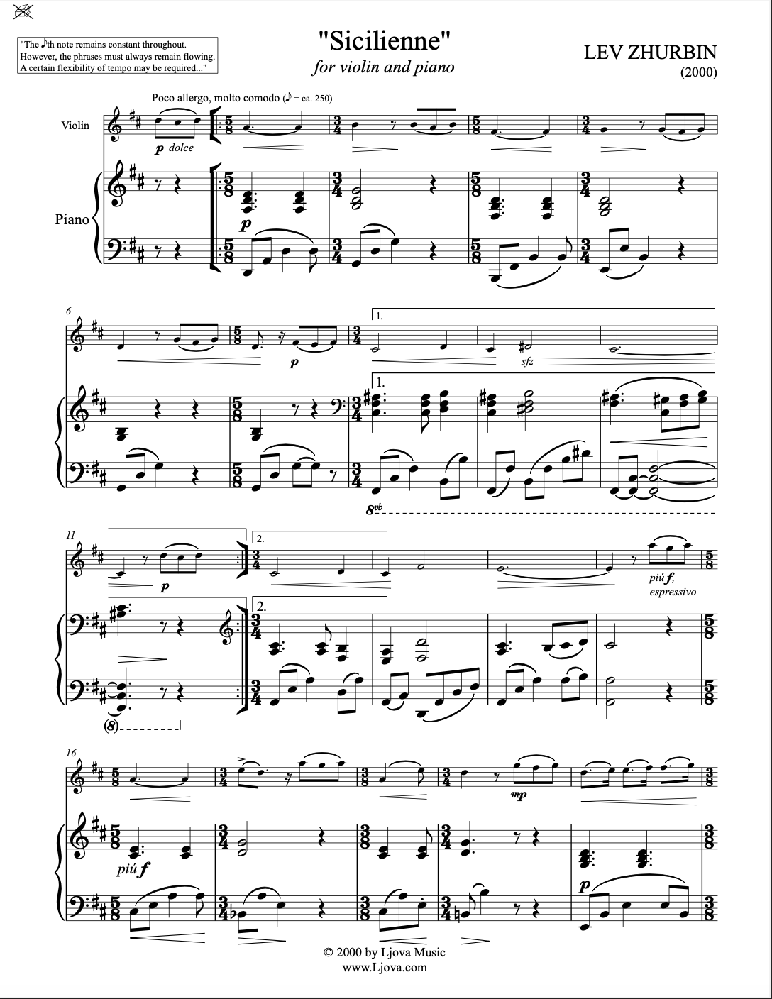 Ljova composed “Sicilienne” while on a Long Island Railroad train. It has since been performed and recorded in its original version for violin and piano, as well as in versions for flute (or recorder) and piano, as well as piano solo.